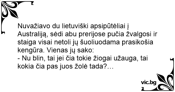 Nuvažiavo du lietuviški apsipūtėliai į Australiją, sėdi abu prerijose pučia žvalgosi ir staiga visai netoli jų šuoliuodama prasikošia kengūra. Vienas jų sako: