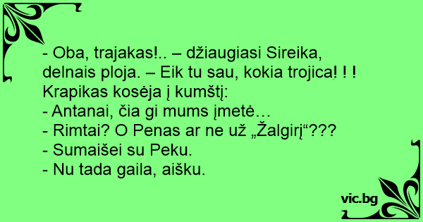 - Oba, trajakas!.. – džiaugiasi Sireika, delnais ploja. – Eik tu sau, kokia trojica! ! !