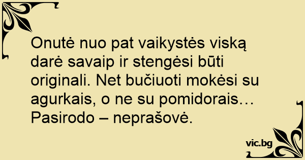 Onutė nuo pat vaikystės viską darė savaip ir stengėsi būti originali. Net bučiuoti mokėsi su agurkais, o ne su pomidorais… Pasirodo – neprašovė.