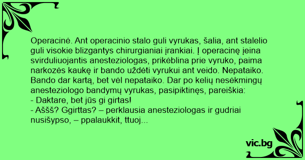 - Aššš? Ggirttas? – perklausia anesteziologas ir gudriai nusišypso, – ppalaukkit, ttuoj chirurgas atteis!