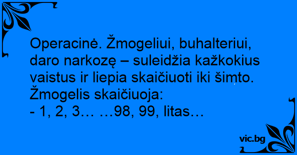 Operacinė. Žmogeliui, buhalteriui, daro narkozę – suleidžia kažkokius vaistus ir liepia skaičiuoti iki šimto. Žmogelis skaičiuoja: