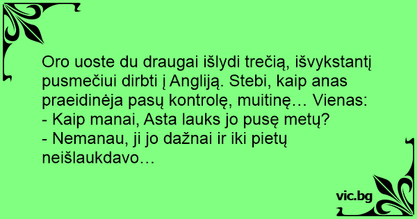 Oro uoste du draugai išlydi trečią, išvykstantį pusmečiui dirbti į Angliją. Stebi, kaip anas praeidinėja pasų kontrolę, muitinę… Vienas: