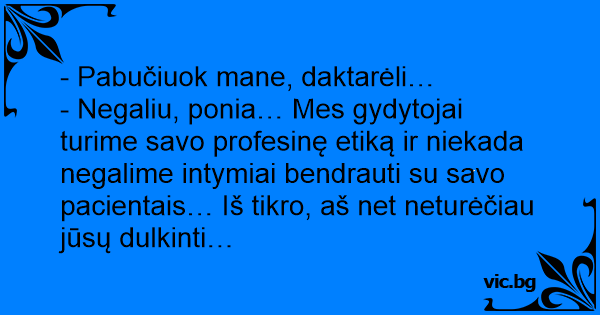 - Negaliu, ponia… Mes gydytojai turime savo profesinę etiką ir niekada negalime intymiai bendrauti su savo pacientais… Iš tikro, aš net neturėčiau jūsų dulkinti…