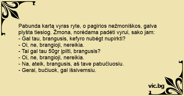 Pabunda kartą vyras ryte, o pagirios nežmoniškos, galva plyšta tiesiog. Žmona, norėdama padėti vyrui, sako jam: