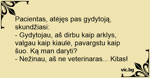 - Gydytojau, aš dirbu kaip arklys, valgau kaip kiaulė, pavargstu kaip šuo. Ką man daryti?