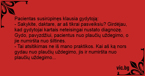 - Sakykite, daktare, ar aš tikrai pasveiksiu? Girdėjau, kad gydytojai kartais neteisingai nustato diagnozę. Gydo, pavyzdžiui, pacientus nuo plaučių uždegimo, o jie numiršta nuo šiltinės.