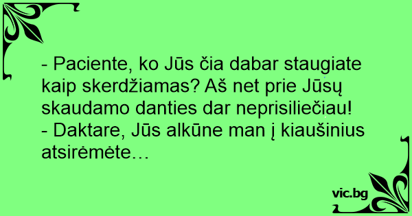 - Paciente, ko Jūs čia dabar staugiate kaip skerdžiamas? Aš net prie Jūsų skaudamo danties dar neprisiliečiau!