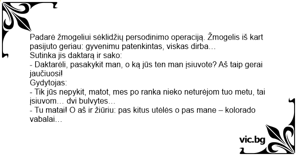 - Daktarėli, pasakykit man, o ką jūs ten man įsiuvote? Aš taip gerai jaučiuosi!