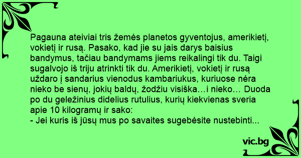 Pagauna ateiviai tris žemės planetos gyventojus, amerikietį, vokietį ir rusą. Pasako, kad jie su jais darys baisius bandymus, tačiau bandymams jiems reikalingi tik du. Taigi sugalvojo iš triju atrinkti tik du. Amerikietį, vokietį ir rusą uždaro į sandarius vienodus kambariukus, kuriuose nėra nieko be sienų, jokių baldų, žodžiu visiška…i nieko… Duoda po du geležinius didelius rutulius, kurių kiekvienas sveria apie 10 kilogramų ir sako:
