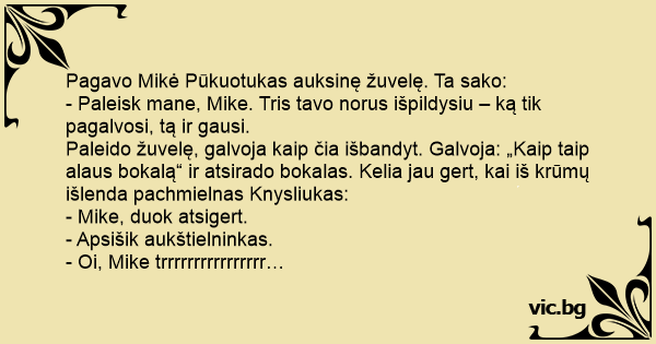 Pagavo Mikė Pūkuotukas auksinę žuvelę. Ta sako: