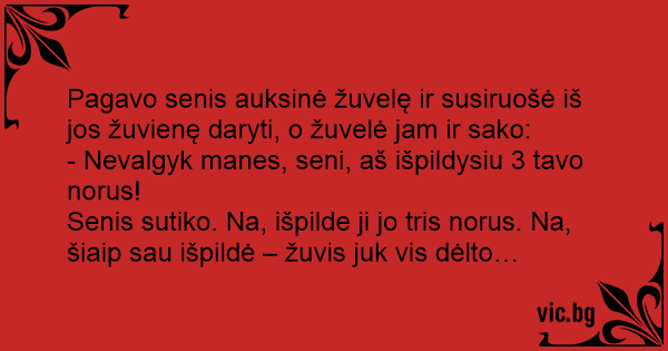 Pagavo senis auksinė žuvelę ir susiruošė iš jos žuvienę daryti, o žuvelė jam ir sako: