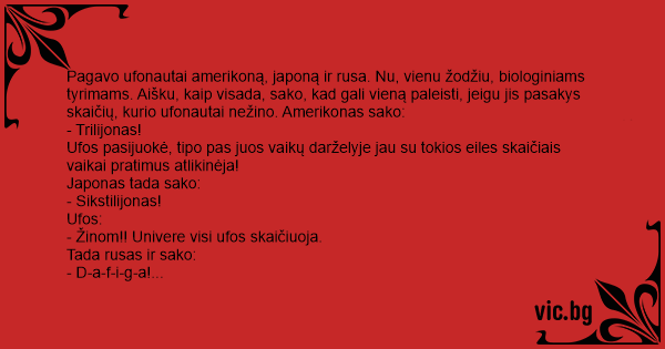 Pagavo ufonautai amerikoną, japoną ir rusa. Nu, vienu žodžiu, biologiniams tyrimams. Aišku, kaip visada, sako, kad gali vieną paleisti, jeigu jis pasakys skaičių, kurio ufonautai nežino. Amerikonas sako: