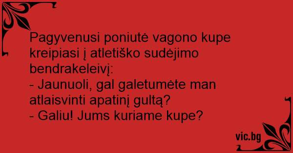 Pagyvenusi poniutė vagono kupe kreipiasi į atletiško sudėjimo bendrakeleivį: