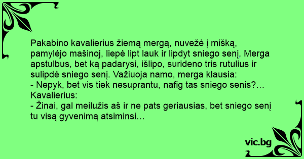 Pakabino kavalierius žiemą mergą, nuvežė į mišką, pamylėjo mašinoj, liepė lipt lauk ir lipdyt sniego senį. Merga apstulbus, bet ką padarysi, išlipo, surideno tris rutulius ir sulipdė sniego senį. Važiuoja namo, merga klausia: