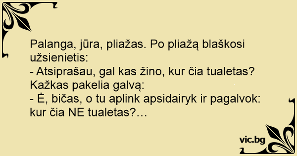 - Ė, bičas, o tu aplink apsidairyk ir pagalvok: kur čia NE tualetas?…