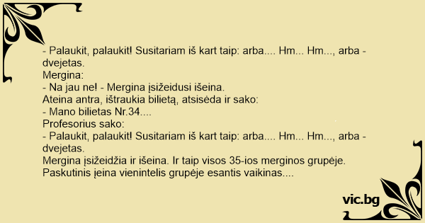 - Tai va, Luščiauskai, susitariam iš karto taip: arba... hm.... Hm..., arba - dvejetas.