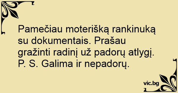 Pamečiau moterišką rankinuką su dokumentais. Prašau gražinti radinį už padorų atlygį.
