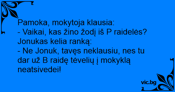 - Ne Jonuk, tavęs neklausiu, nes tu dar už B raidę tėvelių į mokyklą neatsivedei!
