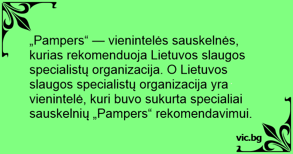 „Pampers“ — vienintelės sauskelnės, kurias rekomenduoja Lietuvos slaugos specialistų organizacija. O Lietuvos slaugos specialistų organizacija yra vienintelė, kuri buvo sukurta specialiai sauskelnių „Pampers“ rekomendavimui.