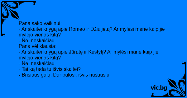 - Ar skaitei knygą apie Romeo ir Džiuljetą? Ar mylėsi mane kaip jie mylėjo vienas kitą?