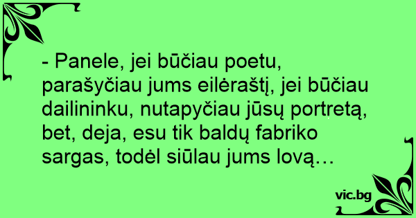 - Panele, jei būčiau poetu, parašyčiau jums eilėraštį, jei būčiau dailininku, nutapyčiau jūsų portretą, bet, deja, esu tik baldų fabriko sargas, todėl siūlau jums lovą…
