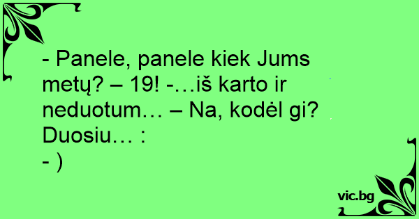 - Panele, panele kiek Jums metų? – 19! -…iš karto ir neduotum… – Na, kodėl gi? Duosiu… :