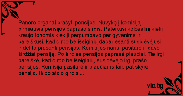 Panoro organai prašyti pensijos. Nuvykę į komisiją pirmiausia pensijos paprašo širdis. Pateikusi kolosalinį kiekį kraujo tonomis kiek ji perpumpavo per gyvenimą ir pareiškusi, kad dirbo be išeiginių dabar esanti susidėvėjusi ir dėl to prašanti pensijos. Komisijos nariai pasitarė ir davė širdžiai pensiją. Po širdies pensijos paprašė plaučiai. Tie irgi pareiškė, kad dirbo be išeiginių, susidėvėjo irgi prašo pensijos. Komisija pasitarė ir plaučiams taip pat skyrė pensiją. Iš po stalo girdisi balsas.