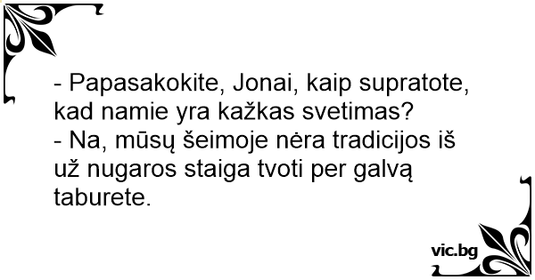 - Na, mūsų šeimoje nėra tradicijos iš už nugaros staiga tvoti per galvą taburete.