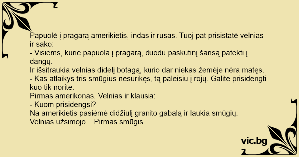 Papuolė į pragarą amerikietis, indas ir rusas. Tuoj pat prisistatė velnias ir sako: