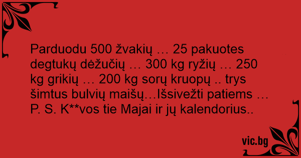 Parduodu 500 žvakių … 25 pakuotes degtukų dėžučių … 300 kg ryžių … 250 kg grikių … 200 kg sorų kruopų .. trys šimtus bulvių maišų…Išsivežti patiems …