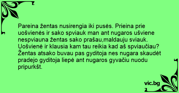 Pareina žentas nusirengia iki pusės. Prieina prie uošvienės ir sako spviauk man ant nugaros ušviene nespviauna žentas sako prašau,maldauju sviauk. Uošvienė ir klausia kam tau reikia kad aš spviaučiau?Žentas atsako buvau pas gyditoja nes nugara skaudėt pradejo gyditoja liepė ant nugaros gyvačiu nuodu pripurkšt.