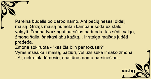 Vyras atsisuka į maišą, pažiūri, vėl užsisuka ir sako žmonai.