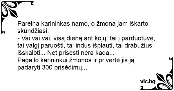 Pareina karininkas namo, o žmona jam iškarto skundžiasi: