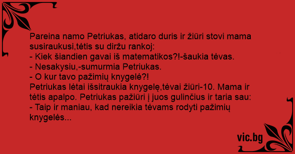 Petriukas lėtai išsitraukia knygelę,tėvai žiūri-10. Mama ir tėtis apalpo. Petriukas pažiūri į juos gulinčius ir taria sau: