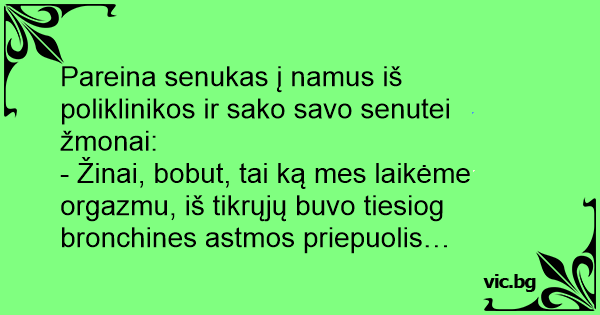 - Žinai, bobut, tai ką mes laikėme orgazmu, iš tikrųjų buvo tiesiog bronchines astmos priepuolis…