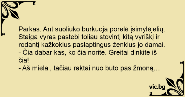 Parkas. Ant suoliuko burkuoja porelė įsimylėjelių. Staiga vyras pastebi toliau stovintį kitą vyriškį ir rodantį kažkokius paslaptingus ženklus jo damai.