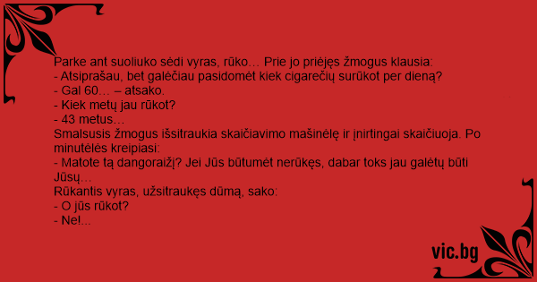 Parke ant suoliuko sėdi vyras, rūko… Prie jo priėjęs žmogus klausia: