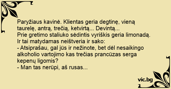 Paryžiaus kavinė. Klientas geria degtinę, vieną taurelę, antrą, trečią, ketvirtą... Devintą...
