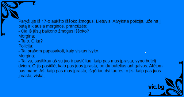- Tai va, susitikau aš su juo ir pasiūliau, kaip pas mus įprasta, vyno butelį dviem. O jis pasiūlė, kaip pas juos įprasta, po du butelius ant galvos. Atėjom pas mane. Aš, kaip pas mus įprasta, išgėriau dvi taures, o jis, kaip pas juos įprasta, viską, kas liko. Po to aš, kaip pas mus įprasta, pasiūliau eiti į lovą, o jis, kaip pas juos įprasta, pasisiūlė atnešti dar gerti. Po kiek laiko grįžo namo mano vyras. Aš jau norėjau, kaip pas mus įprasta, jį supažindinti su savo vyru, bet jis, kaip pas juos įprasta, iššoko pro balkoną...
