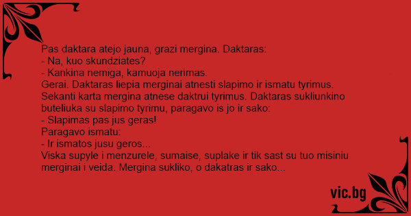 Sekanti karta mergina atnese daktrui tyrimus. Daktaras sukliunkino buteliuka su slapimo tyrimu, paragavo is jo ir sako: