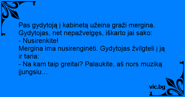 Pas gydytoją į kabinetą užeina graži mergina. Gydytojas, net nepažvelgęs, iškarto jai sako: