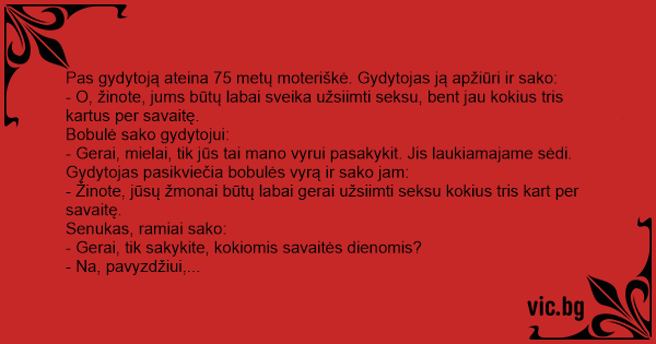 - O, žinote, jums būtų labai sveika užsiimti seksu, веnт jau kokius tris kartus per savaitę.
