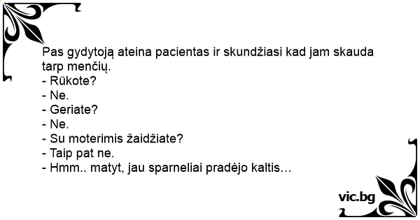 Pas gydytoją ateina pacientas ir skundžiasi kad jam skauda tarp menčių.