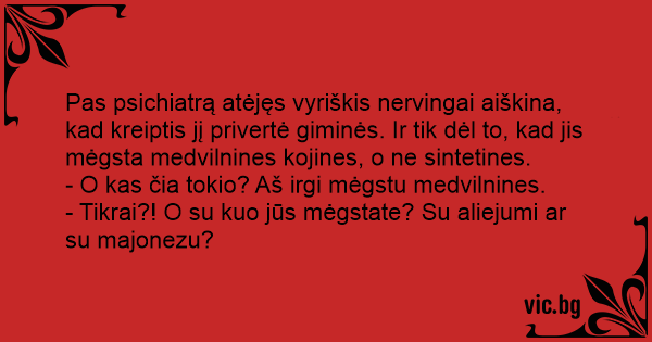 Pas psichiatrą atėjęs vyriškis nervingai aiškina, kad kreiptis jį privertė giminės. Ir tik dėl to, kad jis mėgsta medvilnines kojines, o ne sintetines.