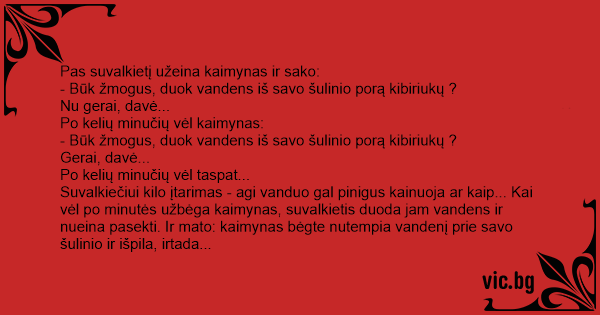 Човек отива при съседа си: Мъж отива при комшията си с две кофи за вода и го пита: Пийва си биричката един човек и в това време търчи съседът му: Прибігає якось кум до кума з пустими відрами та й каже: — Швидко, куме, дайте води набрати. — Та бери. Через 5 хвилин прибігає знову: — Куме, дайте води дуже треба. — Ну бери. Прибігає кум третій... Do właściciela domku z ogródkiem przybiega rozpromieniony sąsiad. - Czy możesz pożyczyć mi dwa wiadra wody? - Oczywiście, ale przecież ty masz własną studnię! - Tak oczywiście ale do niej wpadła... Bonden Egon gick en dag och besökte sin granne och kollega Olle: - Vad vill du? frågade Olle. - Jag ville bara låna 2 hinkar med vatten. - Men du har ju en egen brunn!? - Ja, men frun har... Bonden Per kom med andan i halsen till bonden Jöns: - Har du 2 spannar vatten? Jöns: - Varför då? Du har väl vatten i brunnen själv Per? Per: - Min fru ramlade i brunnen. Men vattnet räcker... Přijde Petr k sousedovi a prosí: „Emane, půjč mi deset kýblů vody.” „Na co ti bude?” diví se soused. „Vždyť máš studnu!” „Víš, spadla mi do ní tchyně - a ještě jí kouká hlava!” Susitinka prie tvoros du kaimynai. Vienas ir sako: - Sveikas, ar gali paskolinti 5 kibirus vandens? Kitas ir klausia: - Taigi tu pats turi kieme šulinį, kam tau 5 kibirai vandens? Pirmasis jam...