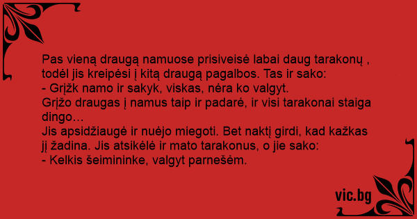 Pas vieną draugą namuose prisiveisė labai daug tarakonų , todėl jis kreipėsi į kitą draugą pagalbos. Tas ir sako: