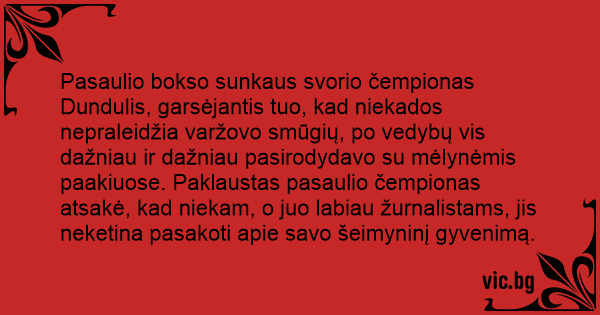 Pasaulio bokso sunkaus svorio čempionas Dundulis, garsėjantis tuo, kad niekados nepraleidžia varžovo smūgių, po vedybų vis dažniau ir dažniau pasirodydavo su mėlynėmis paakiuose. Paklaustas pasaulio čempionas atsakė, kad niekam, o juo labiau žurnalistams, jis neketina pasakoti apie savo šeimyninį gyvenimą.