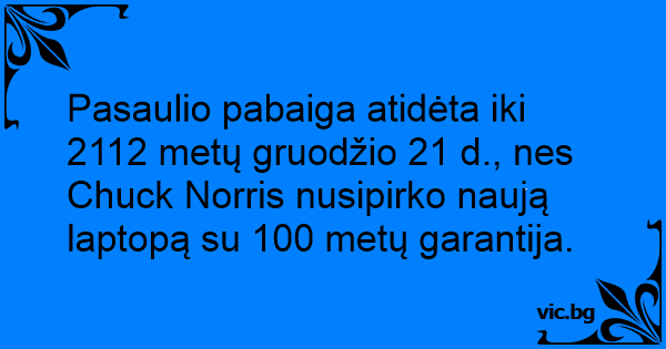 Pasaulio pabaiga atidėta iki 2112 metų gruodžio 21 d., nes Chuck Norris nusipirko naują laptopą su 100 metų garantija.