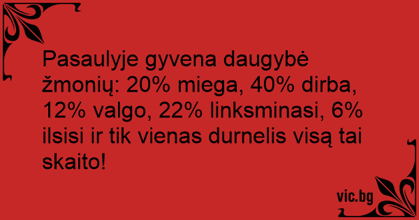 Pasaulyje gyvena daugybė žmonių: 20% miega, 40% dirba, 12% valgo, 22% linksminasi, 6% ilsisi ir tik vienas durnelis visą tai skaito!