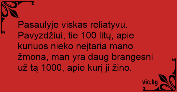 Pasaulyje viskas reliatyvu. Pavyzdžiui, tie 100 litų, apie kuriuos nieko neįtaria mano žmona, man yra daug brangesni už tą 1000, apie kurį ji žino.